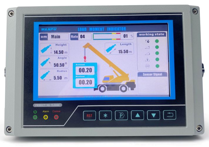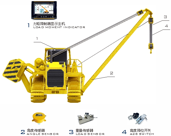 吊管機(jī)力矩限制器主要由力矩限制器顯示器、角度傳感器、重量傳感器、高度限位開(kāi)關(guān)等組成。通過(guò)各傳感器檢測(cè)信號(hào),可以實(shí)時(shí)在顯示器上顯示起重機(jī)的額定起重量、實(shí)際起重量、角度、作業(yè)幅度等信息,并根據(jù)情況輸出報(bào)警信號(hào)和控制信號(hào),輔助作業(yè)人員安全操作起重機(jī)。