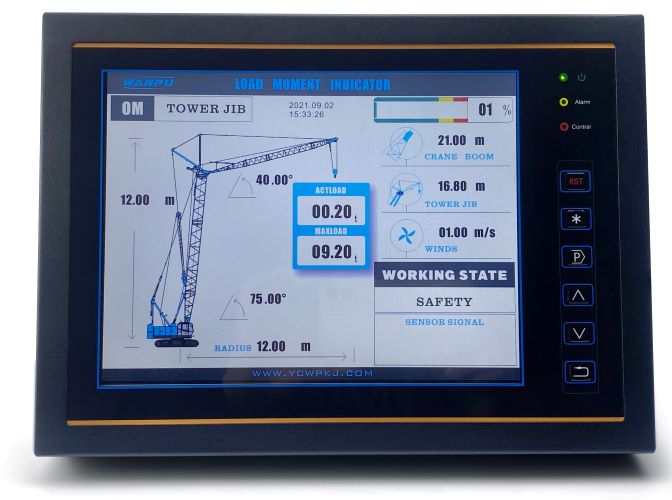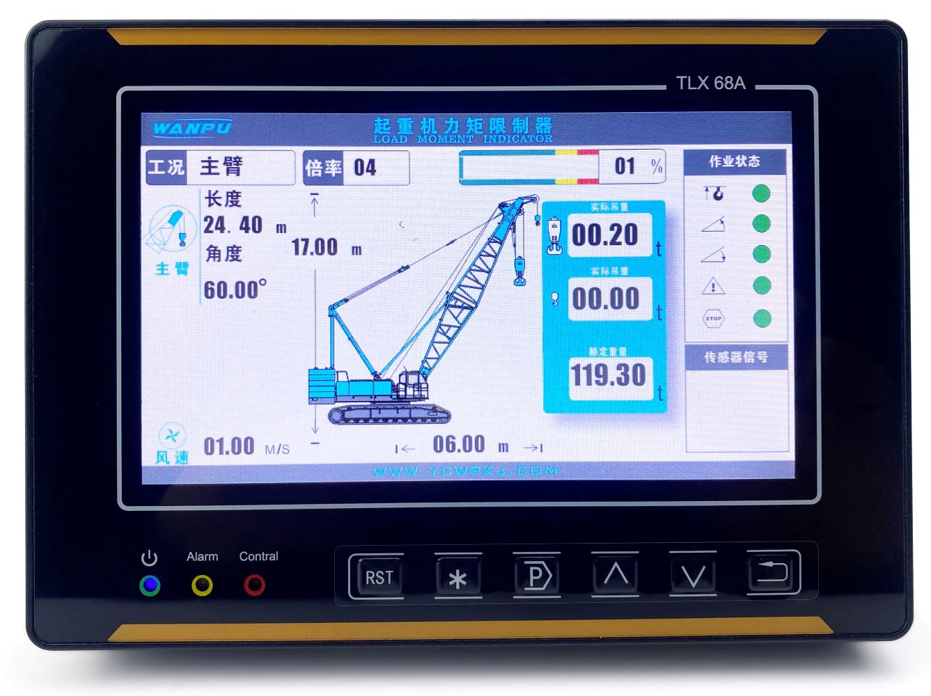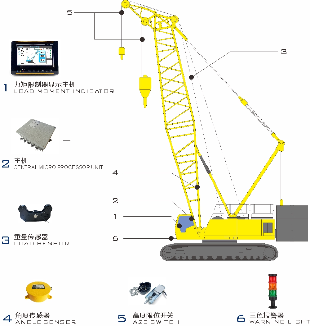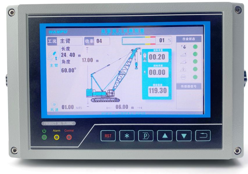 履帶式起重機(jī)力矩限制器主要由力矩限制器顯示器、主機(jī)、角度傳感器、重量傳感器等組成。通過(guò)各傳感器檢測(cè)信號(hào),可以實(shí)時(shí)在顯示器上顯示起重機(jī)的額定起重量、實(shí)際起重量、臂長(zhǎng)、角度等信息,并根據(jù)情況輸出報(bào)警信號(hào)和控制信號(hào),輔助作業(yè)人員安全操作起重機(jī)。