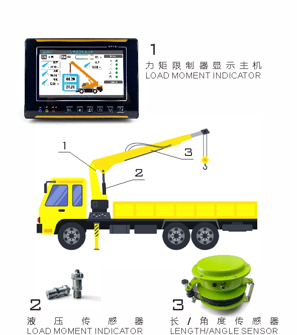 隨車起重機力矩限制器主要由力矩限制器顯示主機、液壓傳感器、長/角度傳感器組成。通過各傳感器檢測信號,可以實時在顯示器上顯示起重機的額定起重量、實際起重量、臂長、角度等信息,并根據(jù)情況輸出報警信號和控制信號,輔助作業(yè)人員安全操作起重機。
